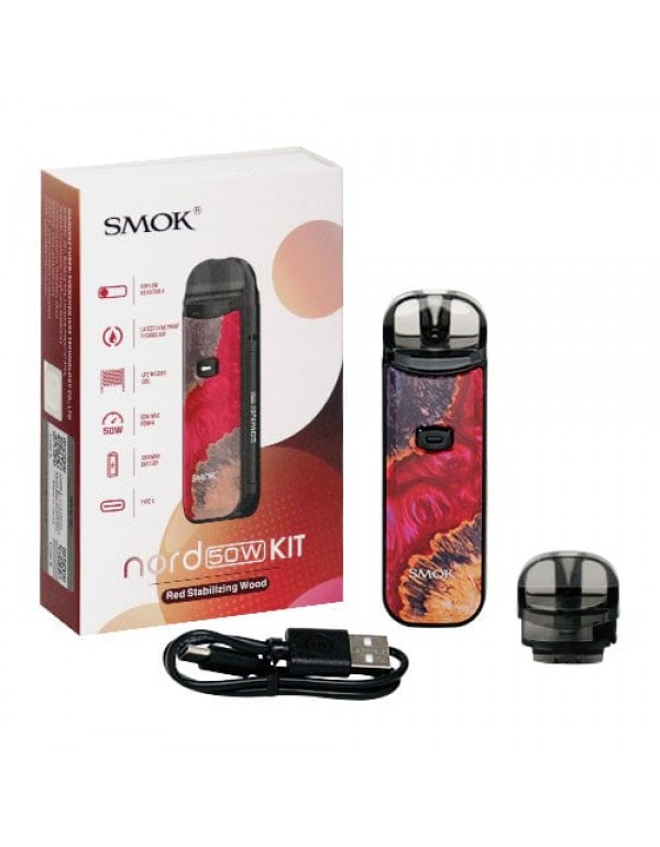 The SMOK Nord 50W Pod Kit features an adjustable airflow control ring, a sturdy drop-resistant body made of zinc alloy, and houses an integrated 1800mAh quick-recharging battery with a Type-C USB charging port built into the bottom. The device also has a 5-50W output range, and the 4-4.5ml pods are compatible with the standard Nord Coil Series vape coil.